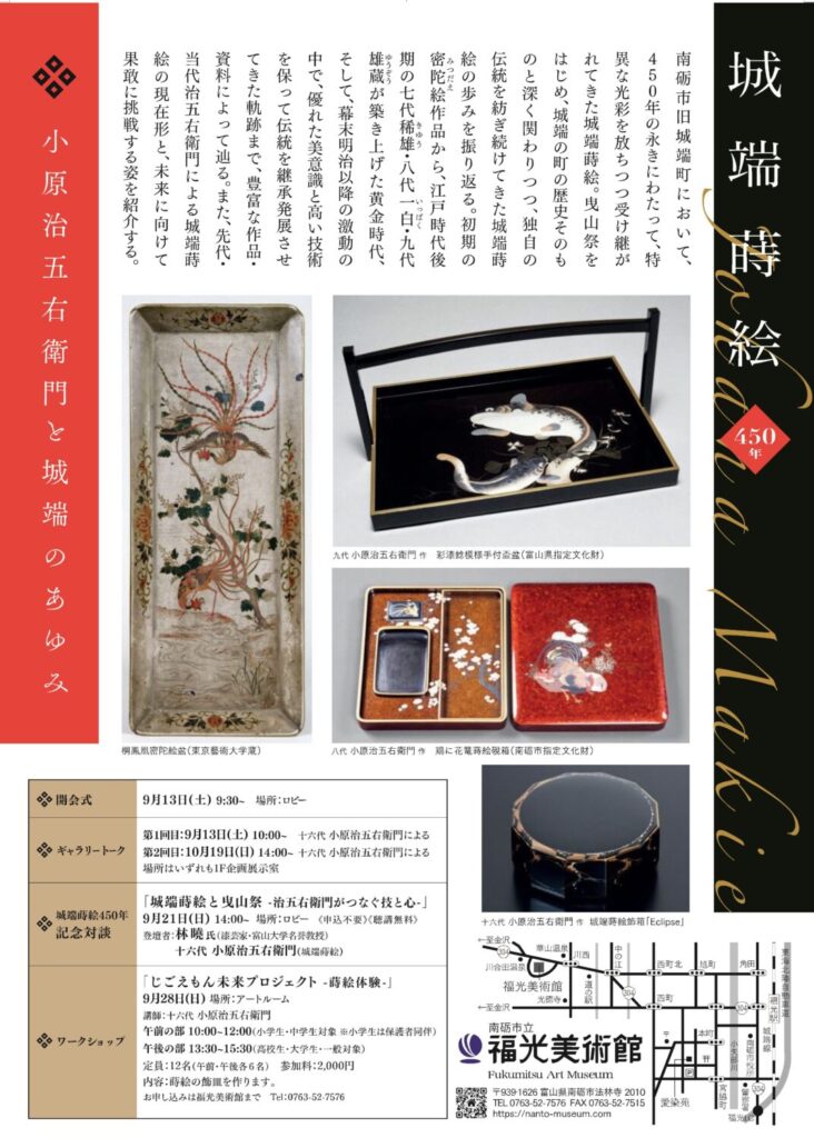 南砺市旧城端町において、450年の永きにわたって、特異な光彩を放ちつつ受け継がれてきた城端蒔絵の周年記念展を開催いたします。曳山祭をはじめ、城端の町の歴史そのものと深く関わりつつ、独自の伝統を紡ぎ続けてきた城端蒔絵の歩みを振り返ると同時に、先代・当代治五右衛門による城端蒔絵の現在形と、未来に向けて果敢に挑戦する姿を紹介いたします。小原家を中心としつつも、その周辺、とくに城端の町の歴史にも光を当てます。