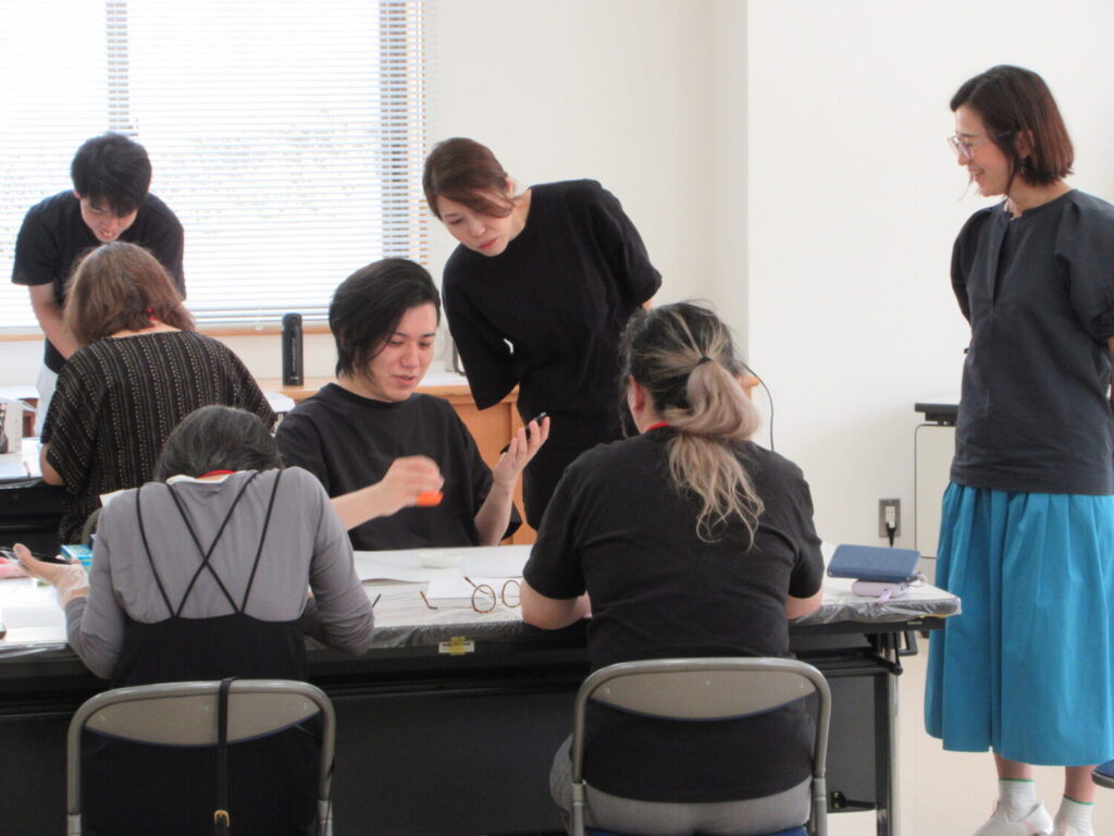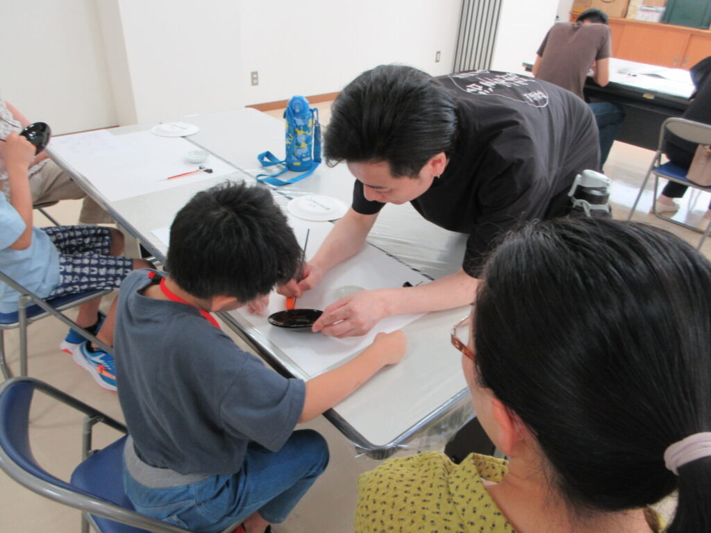 本日9月28日(日)、企画展「城端蒔絵450年 小原治五右衛門と城端のあゆみ」ワークショップ「じごえもん未来プロジェクト-蒔絵体験-」を開催しました。午前の部(小中学生対象)・午後の部(高校生・一般対象)の2回に分けて行いましたが、どちらも大人気で、定員を超えてご参加いただきました。講師の十六代 小原治五右衛門さんの、ときに冗談を交えたきめ細かい指導と、助手の高校生2人のサポートで、みなさん、滅多にできない蒔絵体験を、存分に楽しんでおられました。細い筆で、用意された皿に紅葉を描き、思い思いの色合いに仕上げていきます。用意された紅葉の他に、好みのものを描き加える方もおられ、小原さんの指導で、様々な蒔絵の技術を体験されました。