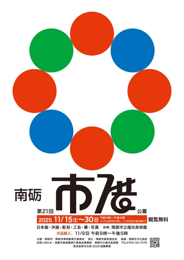 南砺市民および南砺市にゆかりを持つ人を対象とする、日本画・洋画・彫刻・工芸・書・写真の6部門の美術公募展です。