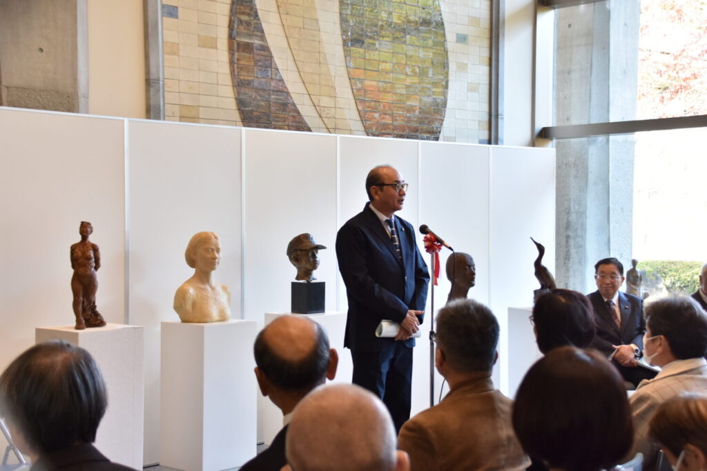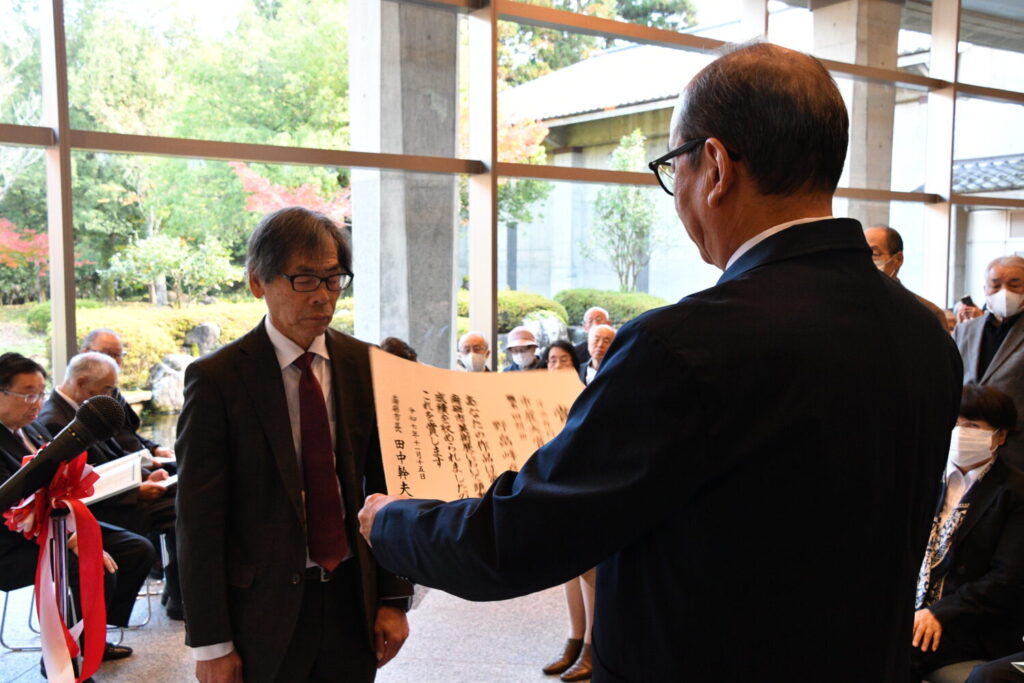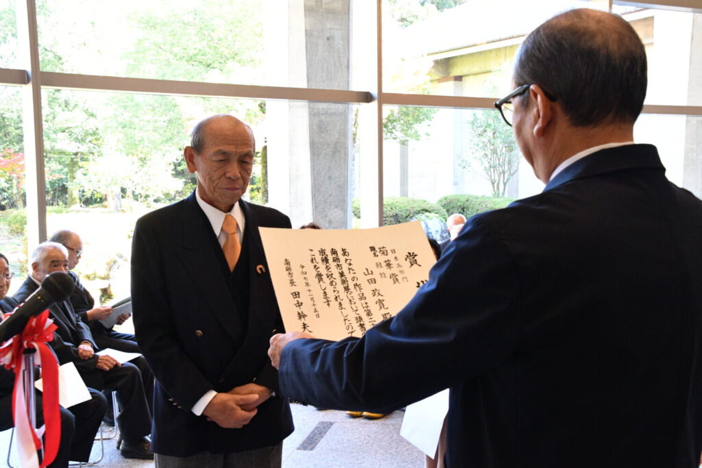 初日の15日は表彰式が行われ、田中市長から各部門の市展大賞受賞者、そして菊華賞の方へ賞状が手渡されました。受賞者を代表して、写真部門で市展大賞に輝いた溝口博昭さんが「皆さまのおかげで受賞することができました。今後も楽しくチャレンジを続けていきたい。ありがとうございました。」と挨拶を述べられました。