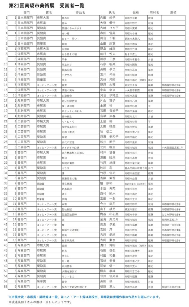 11月15日(土)、「第21回南砺市美術展」が開幕し、日本画・洋画・彫刻・工芸・書・写真の全6部門に、一般作品154点、招待・委嘱作家の作品119点、計273点が出品されています。市展は、今月30日(日)まで、観覧無料。