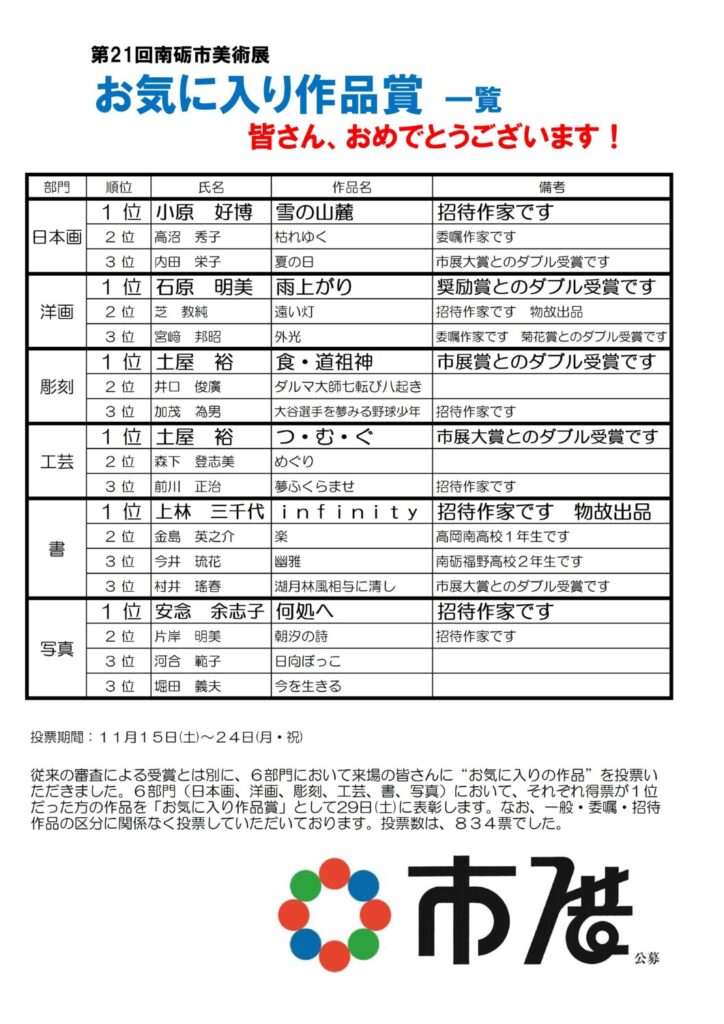 皆さんに投票いただいた結果、第21回南砺市美術展「お気に入り作品賞」が決定いたしました! 6名の皆さんおめでとうございます! 投票いただいた皆さんありがとうございました。