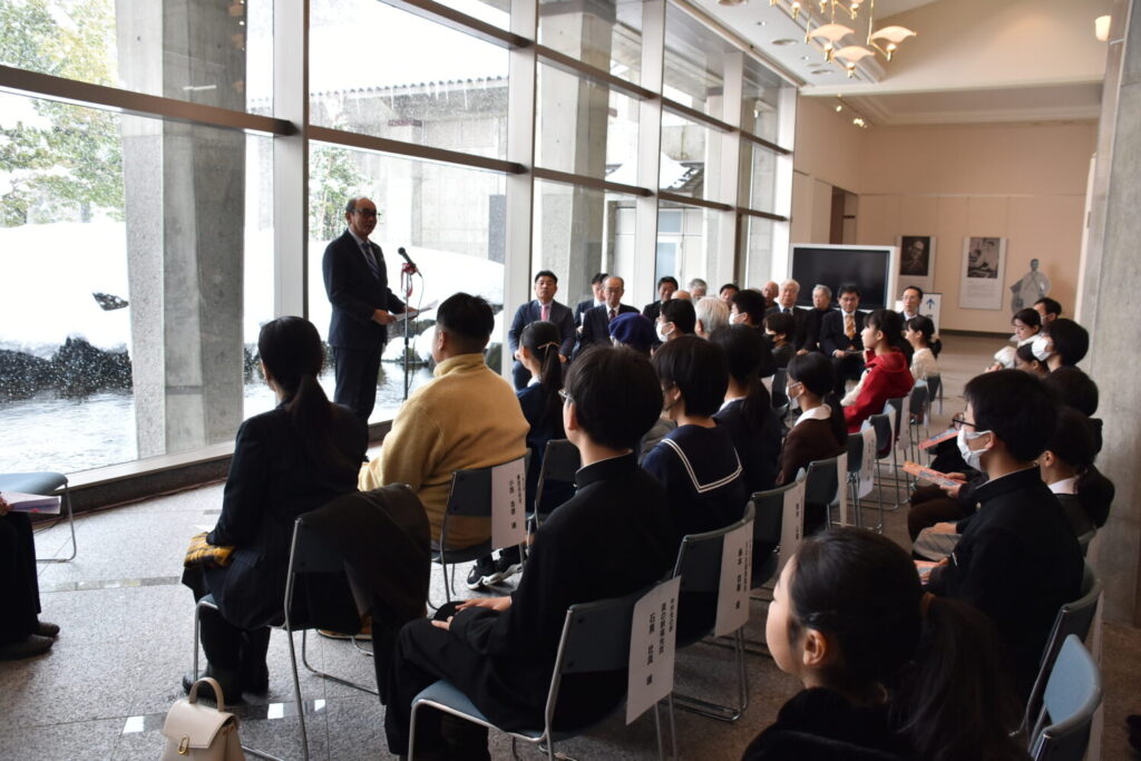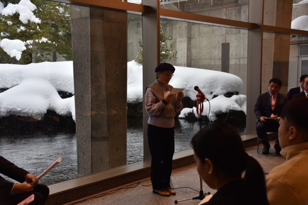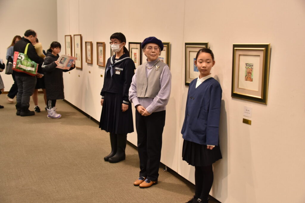 受賞者代表は、一般の部 大賞の坪井富佐乃さん。はるばる神奈川県茅ヶ崎市から来館され、作品の説明をいただきました。作品名は「フローラルの馬」。女神がフローラルな桜の花びらを散らしながら、幸せを運んでくるのをイメージした銅版画とのことでした。