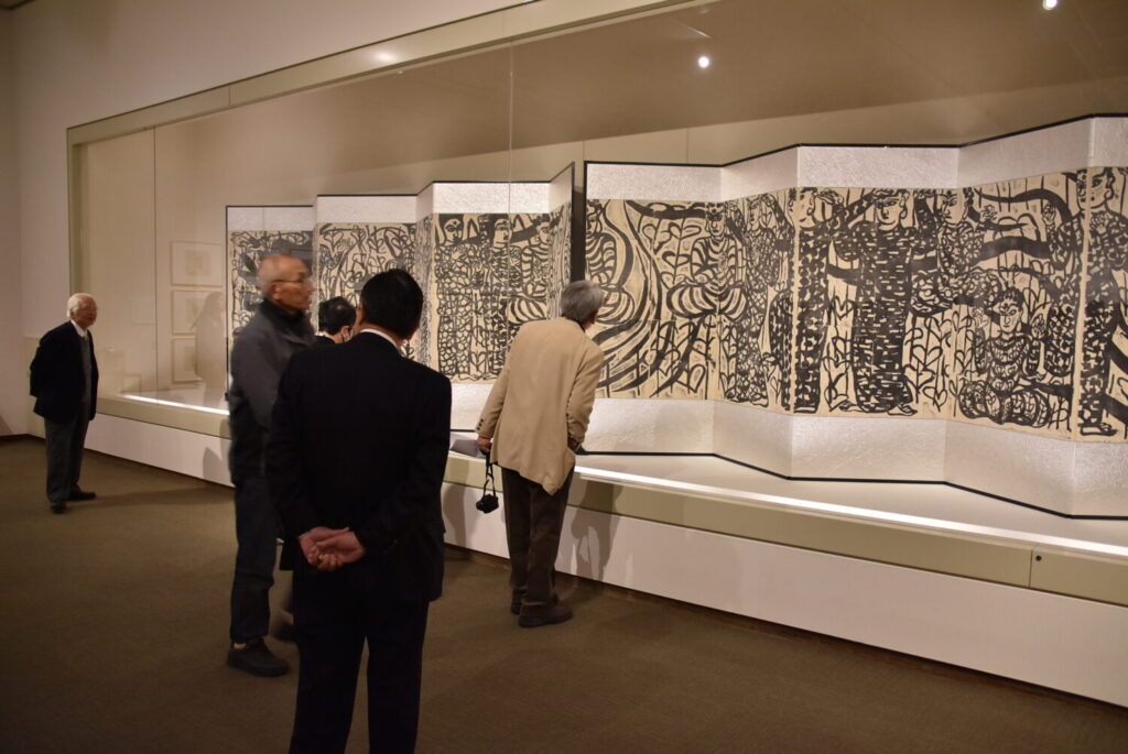 ・続いて、奥のガラスケースには、大作「東北経鬼門譜」の六曲一双屏風が堂々たる姿を見せている。昭和12年当時、志功のふるさと東北は、うち続く冷害、凶作により困窮を極めていた。日本の鬼門に当たる東北の地の救済を祈念して、自らの身を真っ二つに割って悪霊を通してしまう「鬼門仏」を中心に、左右対称に群像を配置した。両端の真っ黒な人物群は、この世に生まれることのできなかった水子たちである。そこから中央に向けて、徐々に光を浴び、中央の鬼門仏が、自己犠牲によって東北の人々を救済する、という構図である。柳宗悦にはこの棟方の思いは伝わらず、出来の良い3カ所だけを抜き摺りするように言われた。それに従って抜き摺りした3幅組のものもあり、それはそれで見事なものだが、やはり、この屏風装で棟方の東北への深い祈念を感じていただきたい。