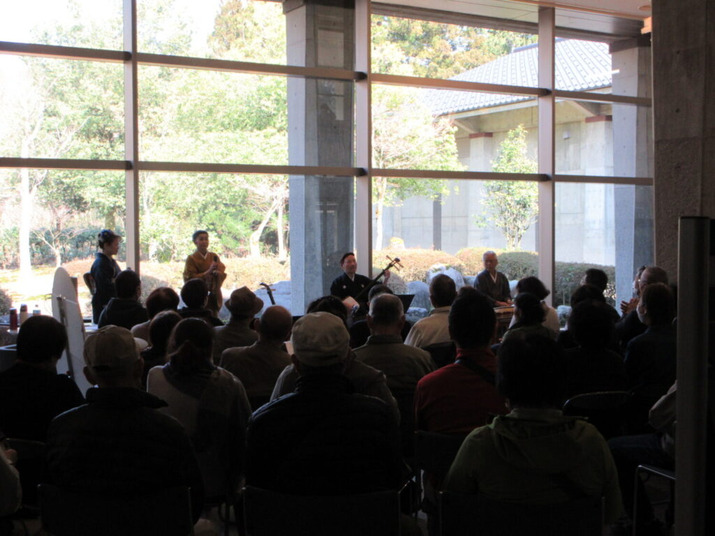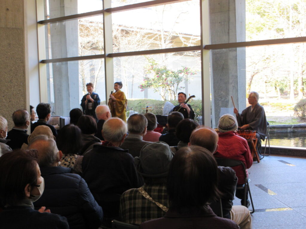 本日3月21日(土)14:00より、当館1階ロビーにて、開催中の「没後50年 深彫り‼ 棟方志功展」関連行事として、緑の森のコンサートを開催しました。青森に生まれ育った棟方志功を記念して、津軽三味線と唄の民謡ショーを行いました。津軽三味線・木田流奏者の林与市郎さんと、唄の斉田恵美子さん(米山甚句全国大会優勝者)、石田進治さん(北日本民謡大賞受賞者)、松井益美さん(福光めでた優勝者)による、素晴らしいコンサートでした。好天に恵まれた春のひととき、100名ほどのみなさんが、聴き入っておられました。